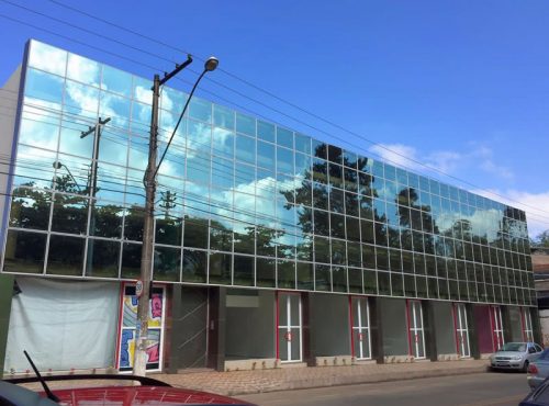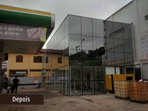 Posto de Combustíveis H7 – Barão de Cocais – MG. A fachada recebeu fechamento em pele de vidro, tipo Glazing e portas da Linha GOLD IV® Alcoa. Os vidros são refletivos na parte superior e incolores na parte inferior da fachada. Obra entregue em 12/2015.