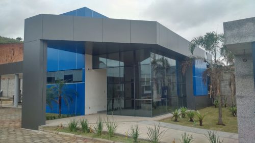 Execução de Fachada e esquadrias internas – obra Sicoob Centro Oeste – Brumadinho – MG. A fachada recebeu revestimento de ACM Stick (na mesma estrutura da pele de vidro) e pele de vidro glazing com vidros refletivos verdes. Portas Glazing com fechaduras magnéticas. Entregue em 03/2016.