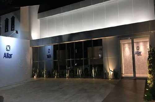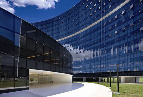 Fachada Glazing Pele de Vidro, com porta Glazing de Correr da Linha Gold IV. O cliente, que fabrica películas orgânicas fotovoltaicas (OPV) aplicou posteriormente na fachada seu produto o que faz esta montagem gerar energia para o edifício. Além da fachada a AlumiGlass forneceu todas as esquadrias internas do edifício.